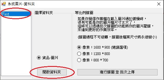 點選【開啟資料夾】,將已經取好名子的圖片檔複製到此資料夾,這時系統將會依照貨品編號與同檔名的圖片自動對應。
