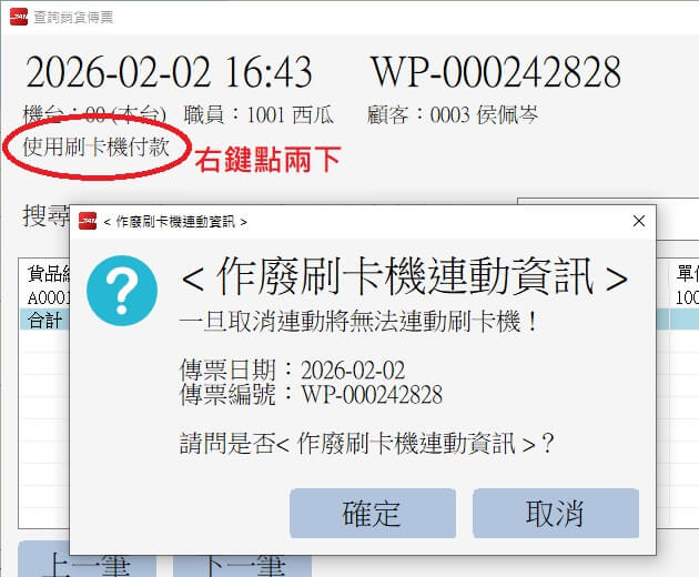 如果這筆消費是使用刷卡機連動消費,不小心手動由刷卡機銷退時,使用滑鼠右鍵點擊兩下,可以強制取消刷卡機連動